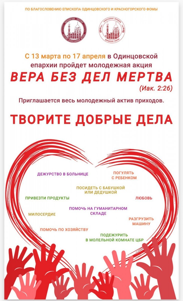 По благословению епископа Одинцовского и Красногорского Фомы с 13 марта по 17 апреля в нашей епархии проходит молодежная акция "Вера без дел мертва".