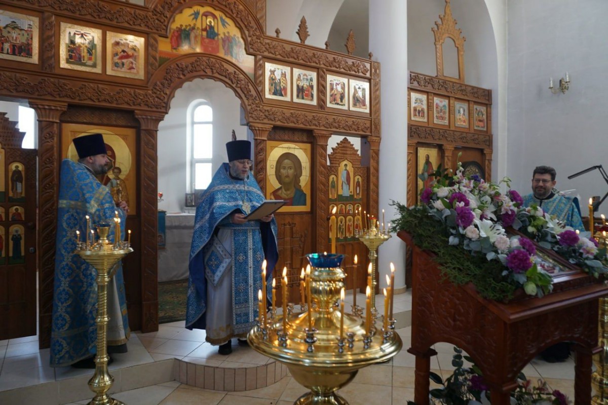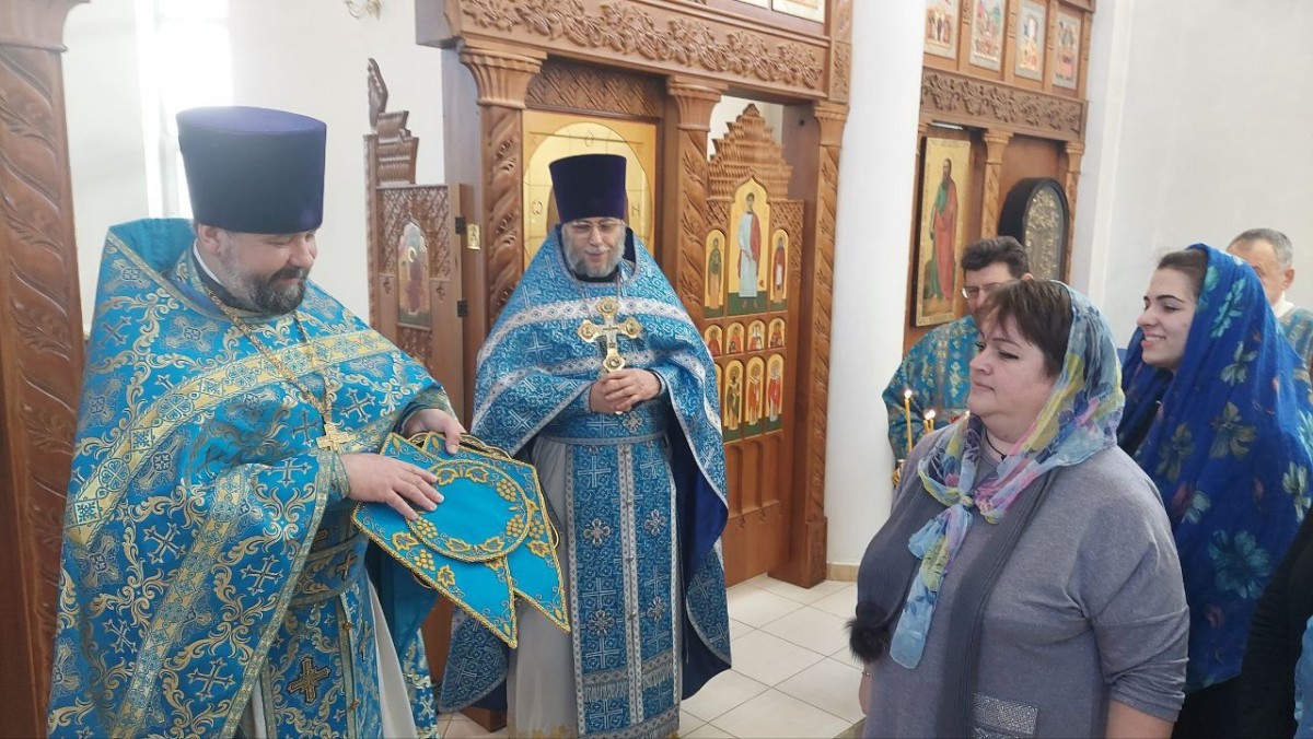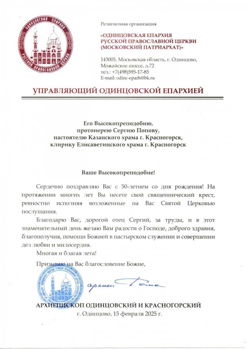 Также благочинный предал поздравительный адрес Управляющего Одинцовской епархией архиепископа Фомы настоятелю храма протоиерею Сергию Попову по случаю его 50-летия. Диакон Сергий и хор пропели батюшке-юбиляру многолетие, а прихожане подарили наперсный крест и набор платов ручной работы под напрестольные кресты и лампаду.