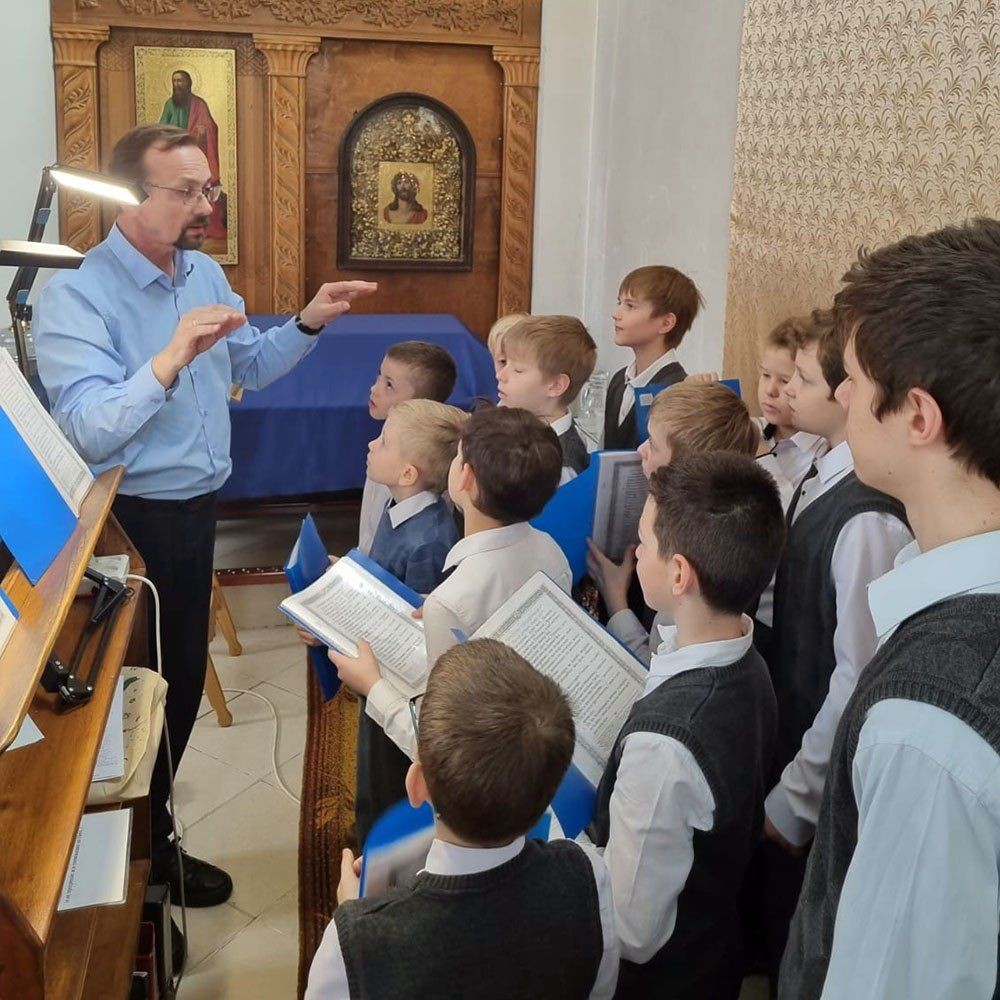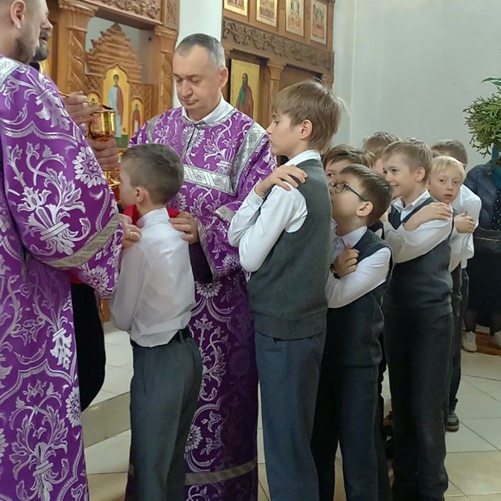 Все юные певчие вместе с директором школы и руководителем хора Алексеем Юрьевичем Пушкиным причастились Святых Христовых Таин.