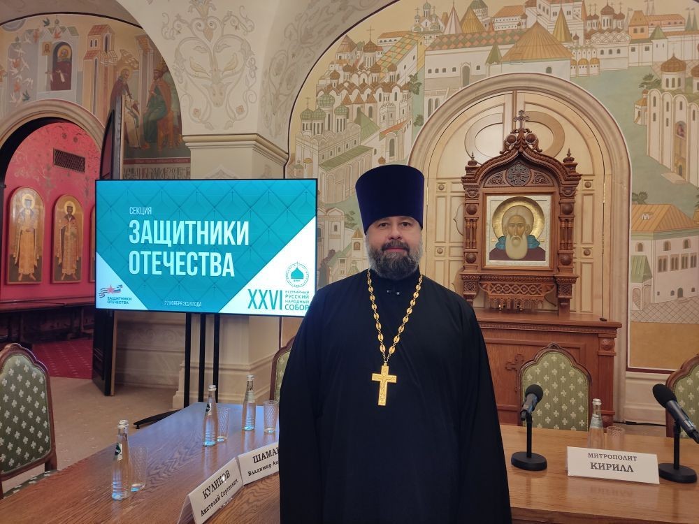 В работе секции "Защитники Отечества" принял участие протоиерей Сергий Попов, который регулярно выезжает в зону СВО для духовного окормления военнослужащих.